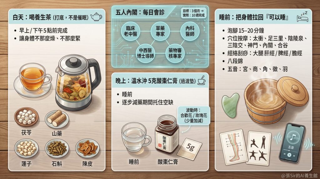 白天(早上或下午五點前)——喝養生茶 我通常在早上或下午五點前喝完養生茶。這杯茶對我而言,不是「催眠」,而是「打底」:讓身體不那麼燥、不那麼緊,晚上才有機會自然沉下去。 (這杯養生茶是四神湯配伍加減石斛、麥冬、陳皮等,配方的細節我會在後續文章逐步分享,這一篇先把戒藥流程交代清楚。)